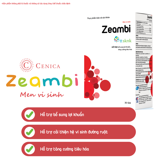 Men vi sinh Zeambi bổ sung những chủng lợi khuẩn tốt cho đường ruột, như L. Paraceisi, L. Reuteri và Bacillus clausi. Đây là men vi sinh chứa cả chủng sinh bào tử và không sinh bào tử, được bao kép 2 lớp bởi công nghệ sinh học, giúp tỷ lệ sống cao hơn so với các chủng men đơn thông thường. Từ đó, giúp giúp cân bằng hệ vi sinh đường ruột, cải thiện rối loạn tiêu hoá như tiêu chảy, sống phân, táo bón… , giúp trẻ ăn ngon tăng hấp thu dinh dưỡng, đồng thời giúp nuôi dưỡng hơn 85% tế bào miễn dịch tại ruột giúp tăng đề kháng cho trẻ.